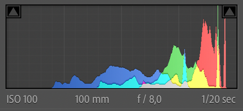 Clipping is a term often used in the context of histograms. What do we mean when we refer to clipping? In general clipping is undesirable and occurs when areas of an image contains no information - in other words, an area of the image is outside the range of the camera sensor. This can present as either clipped highlights (pure white) or clipped shadows (pure black) and is due to extreme over- and underexposure. Clipping can be diagnosed by inspecting the histogram. When you make an image it is often a priority to capture a full tonal range, including whites, highlights, middle tones, shadows and blacks. This would result in a balanced histogram. Clipping is observed as an extremely skewed histogram, when the tail on the left or right is very compressed into either side. Below you will see some examples of this.